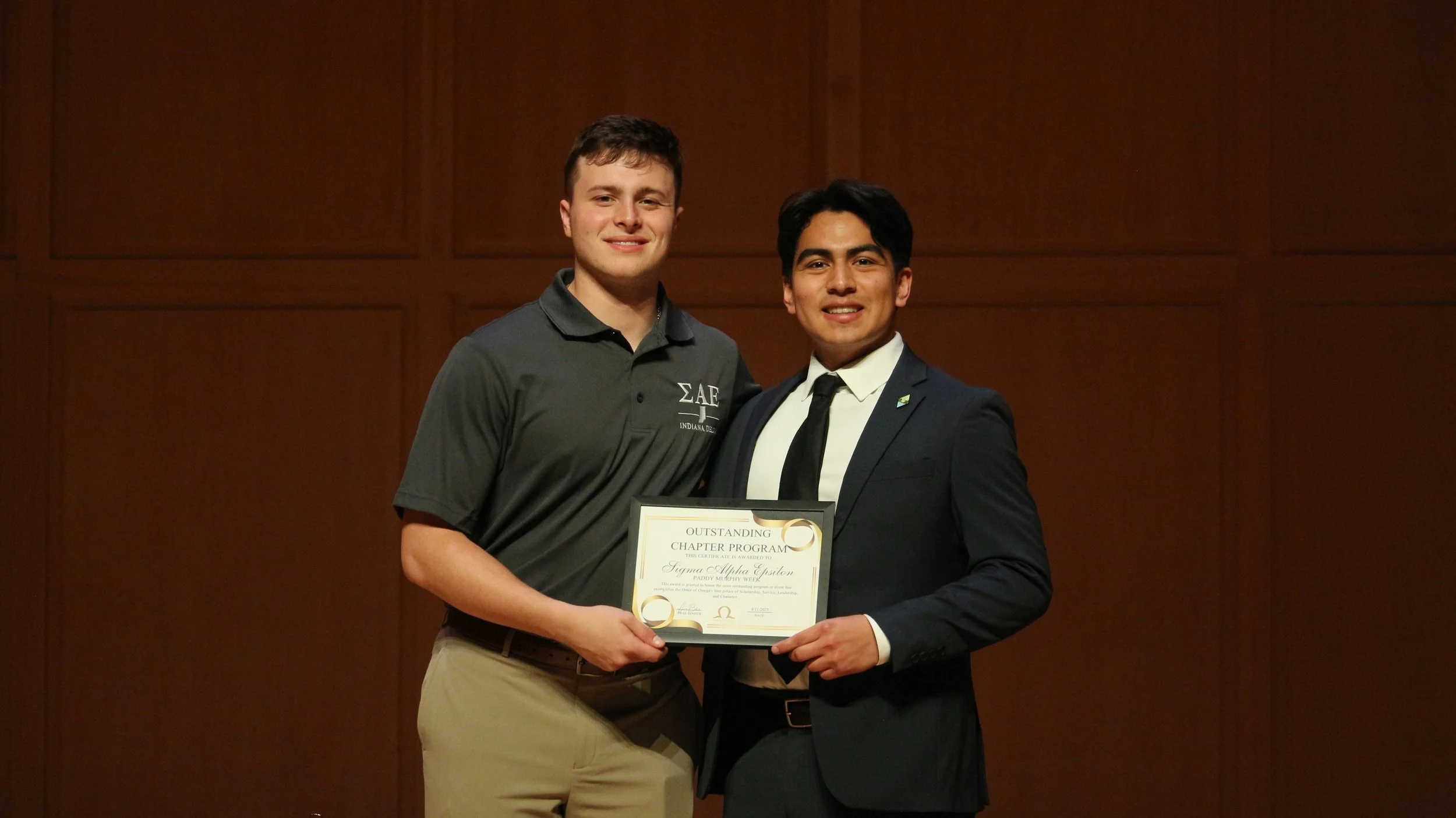 Jack Guiley ‘25 and Zeke Hernandez ‘25 proudly display the award Indiana Delta won at the 2024-2025 Order of Omega Awards